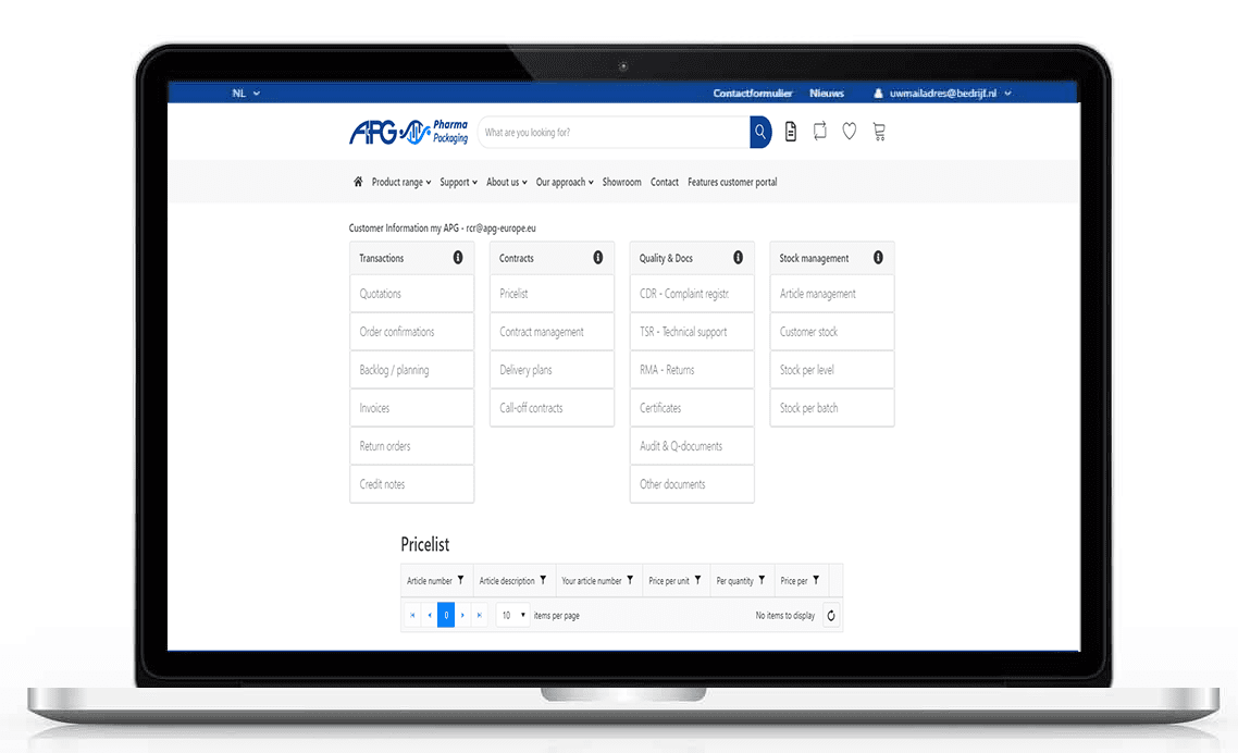 Bij het aanvragen van prijzen voor specifieke artikelen, aantallen en plaats van levering ontvangt u van APG Europe een gedetailleerde offerte. Alle offertes die aan u en uw organisatie zijn uitgebracht vindt u terug onder 'Offertes' binnen de module Transacties.